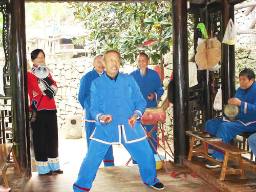 三棒鼓,是以拋三根棒和敲鑼打鼓得名,是土家山寨到處可見(jiàn)的一項(xiàng)以打擊樂(lè)器、口頭文學(xué)、表演技藝合為一體的文體活動(dòng)形式。