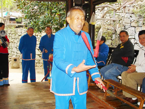 打三棒鼓的技巧性很強(qiáng),思想要高度集中,拋刀拋棒用力要適度,動(dòng)作要敏捷準(zhǔn)確,稍有疏忽大意,不但表演失敗,還會(huì)被刀劃破手腳或誤傷他人。因此,凡是學(xué)打三棒鼓者,均需經(jīng)常練習(xí)飛拋接技術(shù),做到閉目均能拋接刀棒。因此,土家族青少年經(jīng)常用三個(gè)卵石練習(xí)拋接技術(shù),久而久之,熟能生巧,不但會(huì)拋棒,而且能拋刀。