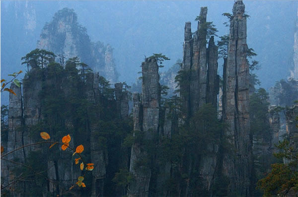 從仙人橋去老屋場,但見深谷里密密麻麻羅列上百座石峰,活像一群威武雄壯的將士列隊聽令,相傳這是向王天子的神兵在聚會。神話雖不可靠,但石峰如此集中壯觀,在武陵源也屬罕見。我想引用一位美術大師的話:“豈有此理,莫名其妙,說也不信,到此方知”。不看神兵聚會,怎知石峰成林。