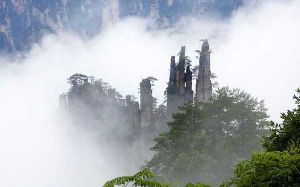 御筆峰是并列的三座石峰,高低不一,峰頂長(zhǎng)有松樹(shù),極象幾枝倒插的毛筆。傳說(shuō)這是向王天子的“御用筆”,故名御筆峰。這里云纏霧繞,似沉似浮,人稱(chēng)“瓊山仙閣”。 |