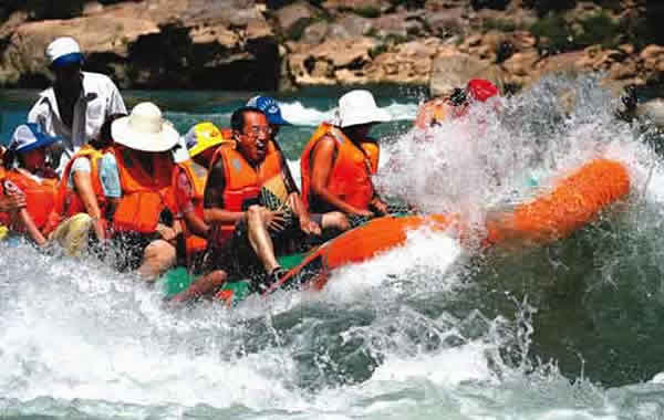 河水更為兇悍強(qiáng)勁,昂頭撤蹄,湍湍東去。一灘連一灘,一浪挽一浪。百里河流百里灘,百里流水百里浪。茅巖河水無情地撞擊著河中根基深厚的礁石,盡管撞擊得頭破血流,斷腸裂肺,粉身碎骨,依然無怨無悔,從不停歇地演繹著生命的壯觀。被撕碎的生命化成點點銀珠拋上天空,繼而又落回永不消逝的軀體上,織就了一幅生生不息的王母娘娘灑降甘露圖。而被河水沖撞了千百年仍然傲然屹立的礁石,撕破了河水剛剛要向人展示玉脂般的肌膚,又被洶涌而至的河水淹沒,再次擊起滿天銀花。前進(jìn)與阻擋相搏發(fā)生的巨大轟鳴,在河谷里一次又一次的回響,在群山中一次又一次地震蕩。若乘坐皮筏或小舟在河上漂流,一種無以言狀的享受游走在每根神經(jīng)。人時而被軟若無骨的河水拋上浪尖,時而又被它牽扯著跌入峰谷。會不由自主地發(fā)出享受大自然賦予的刺激的無險驚叫。尖叫聲與浪濤聲匯成了一支歡樂的樂章。