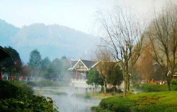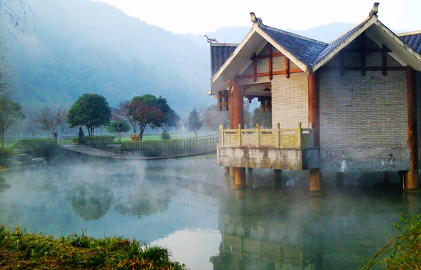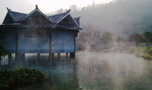 “泉源沸涌,浩氣云浮!睋(jù)了解,黃龍洞生態(tài)廣場的水源出自于洞內(nèi)的地下河,水溫常年保持在16攝氏度左右。當從洞內(nèi)流淌出來的溫暖水流與洞外的低溫空氣相遇之后,頓時形成沸騰的水汽,從而形成“浩氣”景觀。