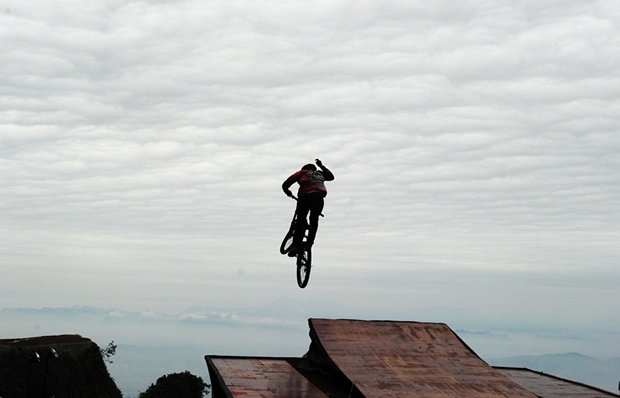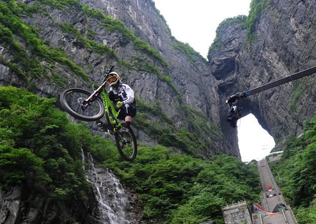 張家界天門(mén)山天門(mén)洞,999級(jí)臺(tái)階,以39°斜坡筆直往下,看一眼都覺(jué)得眩暈。如果有人騎著山地車(chē)一路沖下來(lái),你一定會(huì)說(shuō)“瘋了!”。
