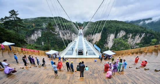 張家界大峽谷玻璃橋位于湖南省的張家界大峽谷景區(qū)栗樹埡和吳王坡區(qū)域內(nèi),為一座景觀橋梁,兼具景區(qū)行人通行、游覽、蹦極、溜索、T臺等功能。主跨430米,一跨過峽谷,橋面長375米,寬6米,橋面距谷底相對高度約300米。這座全透明玻璃橋長度、高度位居世界第一玻璃橋建成后,將成為世界首座斜拉式高山峽谷玻璃橋;并創(chuàng)下世界最高最長玻璃橋、首次使用新型復(fù)合材料建造橋梁等多項世界之最。