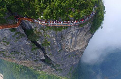 站在棧道上俯瞰群山,古人“會當(dāng)凌絕頂,一覽眾山小”的感覺油然而生。由于天門山是國家森林公園,植被特別豐富,加上典型的喀斯特地貌,所以,在這條棧道上更能找到一種在乘坐直升飛機(jī)飛越熱帶雨林大峽谷的感覺,這平時只能在電影里看到的場景,在這里能讓你身臨其境。